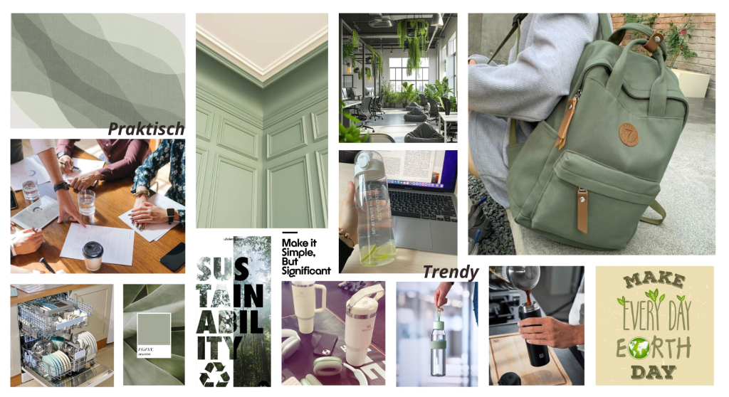 In mijn moodboard zie je vooral terug dat focust op gemak, praktische en stijlvol. Een product wat je eigenlijk bij je wil hebben, daarbij staat de zacht groene kleur centraal. Een stukje kalmte straalt het uit en legt de onbewuste link voor de gast van duurzaamheid.